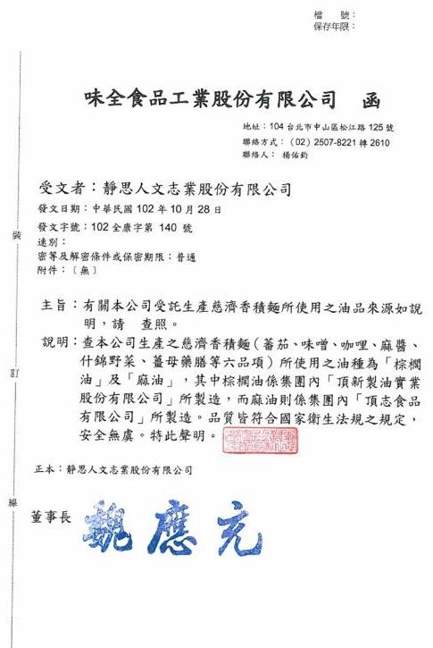 PS:如圖二味全公文所示:香積麵內含「頂新棕櫚油」及「頂志麻油」(頂志:中國頂新)